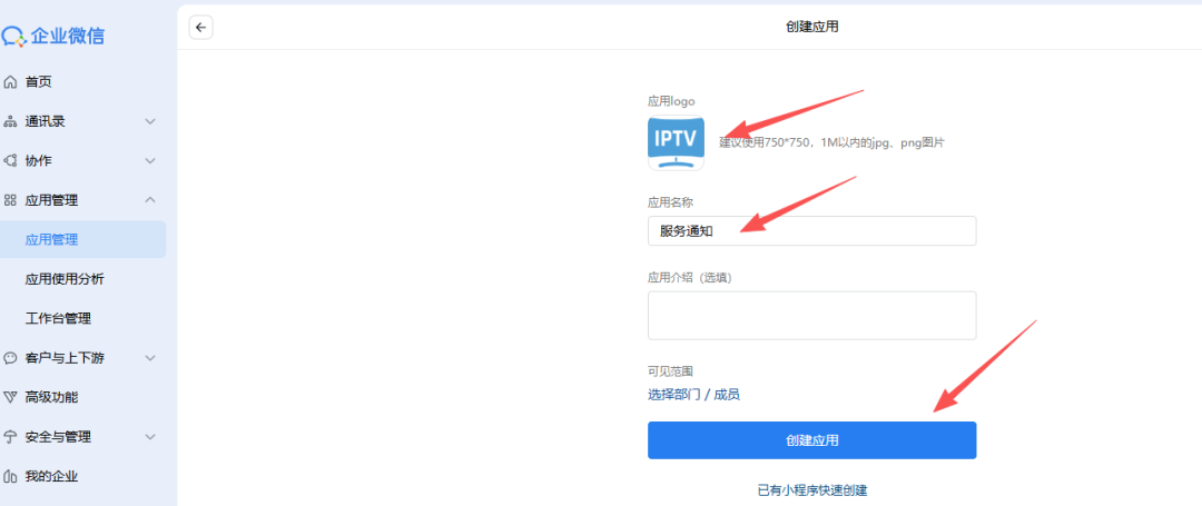 应用管理-创建应用 上传应用logo和命名,如“服务通知”