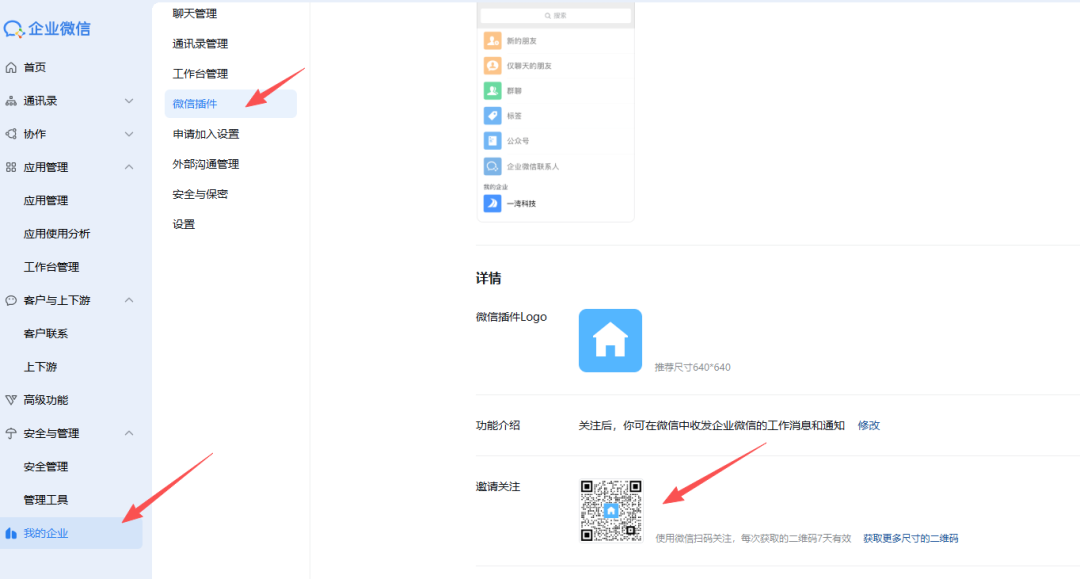 在个人微信接收消息: 在“我的企业” ,“微信插件”,用你的个人微信扫码关注。这样,以后应用发出的消息,就会直接推送到你的个人微信对话框里 !