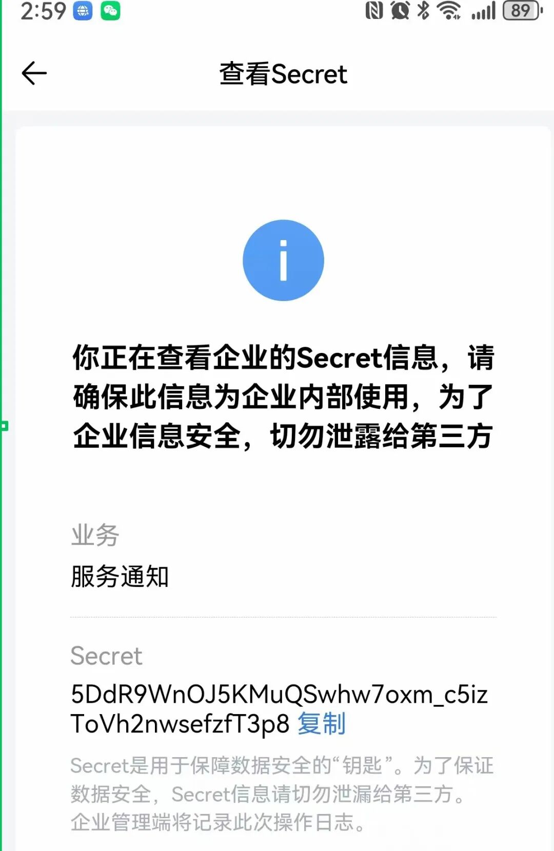 企业微信接收Secret 这里我拿到了三个值:CorpId(ww9d30674c8fb35728),AgentId(1000002)和Secret(5DdR9WnOJ5KMuQSwhw7oxm_c5izToVh2nwsefzfT3p8)