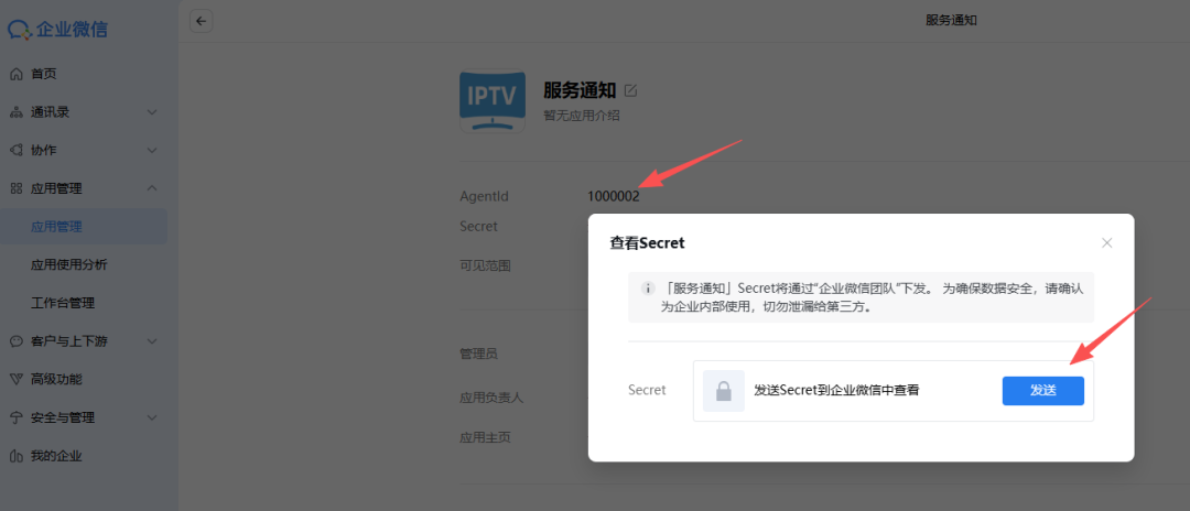 CorpId(在“我的企业”中获取)CorpId获取 Secret(在自建应用详情页发送到企业微信获取)AgentId(在自建应用详情页获取)AgentId和Secret获取 注意:Secret是发送到企业微信,这里需要安装企业微信并登录才能获取到: