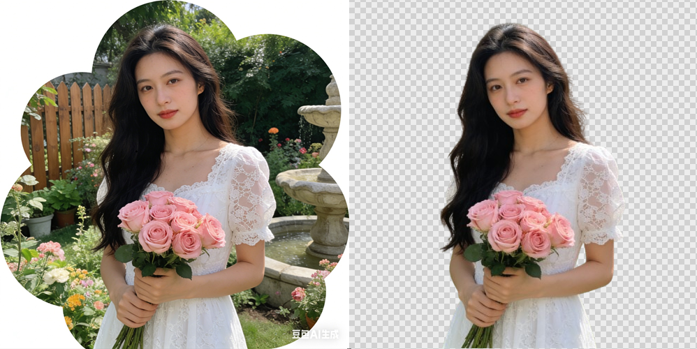 哪怕背景里有花朵、喷泉、栅栏这些复杂的元素,人物的发丝边缘依然被处理得非常自然。不论是做自媒体封面、证件照换底色,还是做海报素材,都完全够用了。